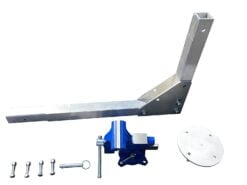 Vise and bracket attachment consists of 2 parts, 4 1/2 ” vise and folding ‘L’ shaped bracket. Hole drilled near end of extension accepts hitch pin for assembly and use. Vise is attached to vise-mounting surface by 4 bolts.